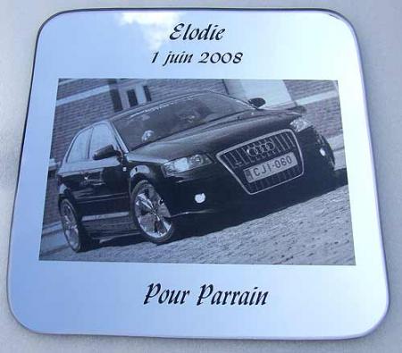 Miroir de 20 sur 20 cm avec gravure photo , texte et support à poser ou support mural pour 49 euros.