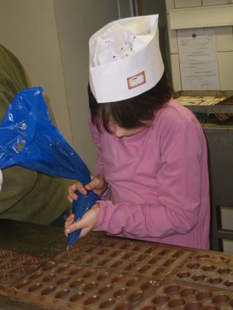 Chaque petit chocolatier a moulé un moule de pralines différent. Après un passage dans le frigo, il fallait le remplir de praliné à l'aide d'une poche. Ouh la la, c'est plus facile à dire qu'à faire!! Après un deuxième passage dans le frigo, le démoulage pouvait avoir lieu, puis la mise en sachet. Chaque enfant a ainsi réalisé de A à Z une petite série de pralines, qu'il a ramenées chez lui pour dégustation, ainsi que le sujet en massepain enrobé de chocolat.