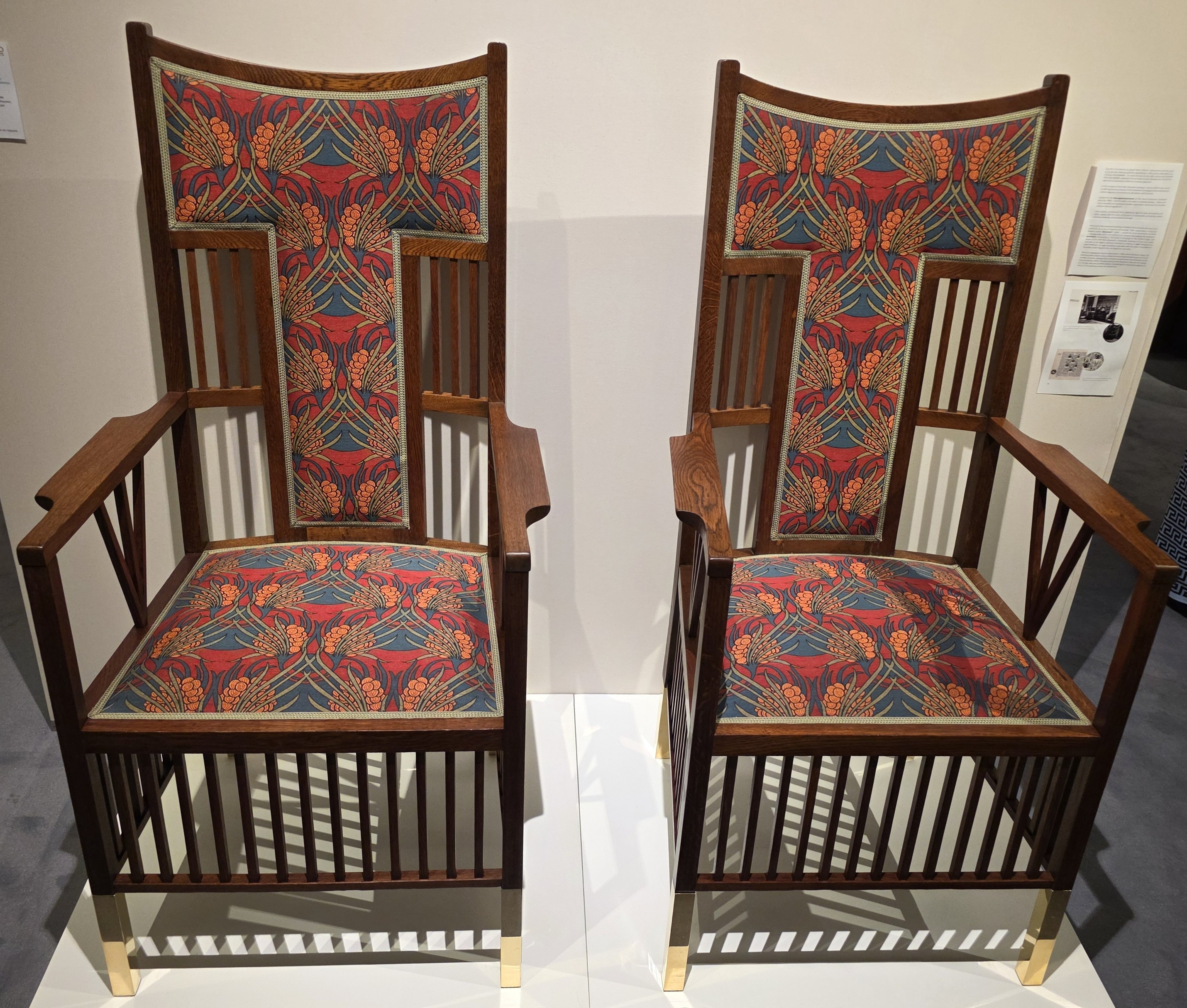 *** "Florian Kolhammer" (stand 147) nous présente une paire de fauteuils de la IIe exposition de la Sécession viennoise (1898), conçus par Joseph Maria Olbrich & réalisés par Friedrich Otto Schmidt, en chêne massif, laiton et textile, ils faisaient partie, à Vienne, du mobilier d'une "Kunstgewerbezimmer", une pièce dédiée, en 1900, aux arts appliqués, symbole de l’énergie artistique et intellectuelle.