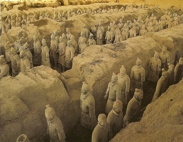 Autour de son tombeau, il fit construire des fosses remplie de soldats en terre cuite (reproduction grandeur nature et dont chaque guerrier avait un visage différent.) Bien que la construction de son tombeau était contradictoire à ses idées de vivre éternellement, il était convaincu qu’il devait être toujours défendu par ses guerriers, c’est pourquoi son tombeau étant sous terre, il fit creuser ces fosses immenses dans lesquels son armée de terre cuite le défendrait à tout jamais.