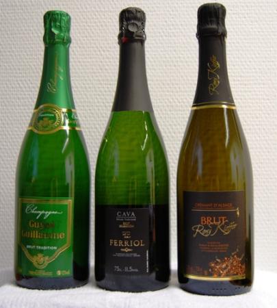 1 – Ces trois boissons citées, Champagne, Crémant et Cava, sont réunies dans une seule prise de vue. Remarquez que les trois contenants sont ressemblants.