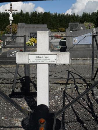 La sépulture de Henri Sebald, le premier soldat français décédé hors de France, durant la guerre 14-18. Il rendit l’âme à Houffalize dans une embuscade qui donnera son nom à la rue de l’Escarmouche. -