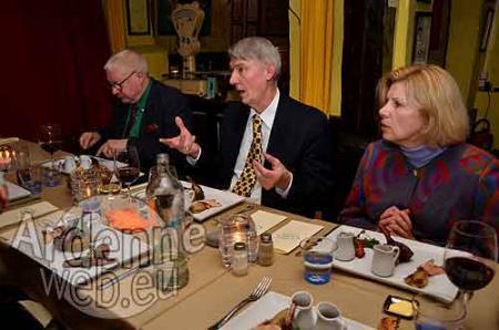 Dès l'entrée, l'histoire se met à parler. D'où vient donc cette taque en fonte dont les personnages nous sont inconnus, de même que les inscriptions du fronton ? Plus loin, un saint dans sa niche veille sur le bon aboutissement de nos appétits, tandis qu'en face de lui se dresse un personnage passablement impressionnant : Charlemagne? C'est fort possible. Mais à cette époque, tout le monde ressemblait à Charlemagne. La brique, et surtout le bois, sont les grands architectes d'un décor d'une amène rusticité. Les poutres sont dignes d'un Musée de la Vie Quotidienne. Deux pièces en enfilade, une mezzanine avec un vieux pupitre d'école, deux petites pièces d'un romantisme touchant, permettent à l'amateur d'opérer des choix avant de s'attabler, ou de prendre l'apéritif au bar aménagé au fond de la salle principale.