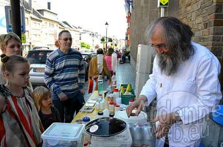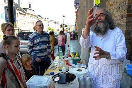 Puis avec une cuillerée à café de sucre, de sel de cuisine et de chlorate de potassium mélangés, et un mini lance-flamme, il va faire exploser le cocktail. « Les enfants, ne m’imitez pas, c’est une bombe que vous venez de voir. Avec le chlorate de potassium, c’est la couleur de l’éclairage des autoroutes que vous venez de voir. Chaque métal - ici le chlorate de potassium- perd son énergie en dégageant une couleur spécifique. C’est ainsi qu’on reconnaît la matière des étoiles. »