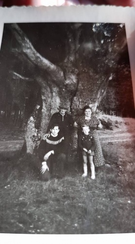 Toujours est-il qu’au témoignage de familiers des lieux corroboré par la comparaison entre la photo qui nous vient de Pierre Wagner, où il pose avec sa famille houffaloise en 1956 et la peinture que nous exposons également, datée de 1987, il a dû souffrir d’un ou plusieurs fameux coups de foudre dans cet intervalle : en atteste que le peintre n’a perçu que des branches quasi mortes sur la gauche.