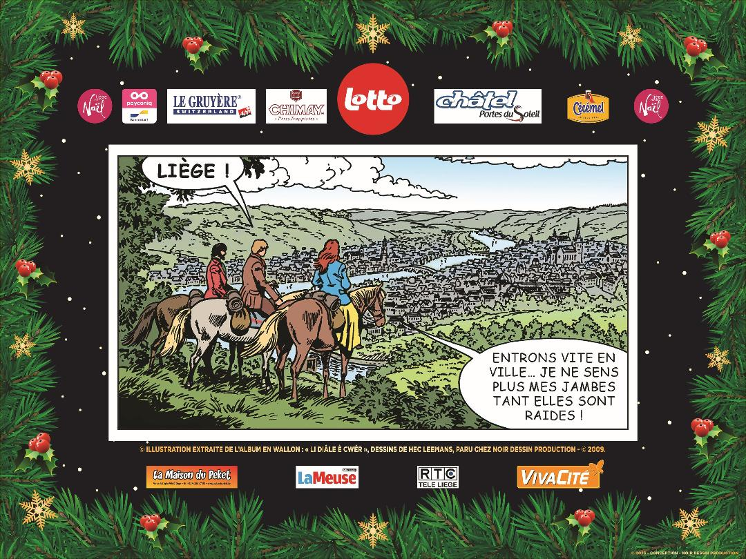 Quant à l’enceinte du « Village de Noël », elle est décorée de 21 panneaux, mettant en avant la Ville de Liège dans la BD, Noël et la BD, au travers d’agrandissements de cases, issues d’albums édités, le thème de Noël étant ainsi valorisé par des dessins de Didier Casten, André Franquin, Marc Hardy, « Malik » (William Tai), « Peyo » (Pierre Culliford), François Walthéry & Marc-Renier Warnauts.