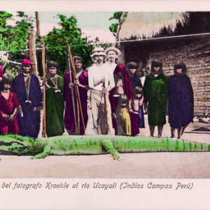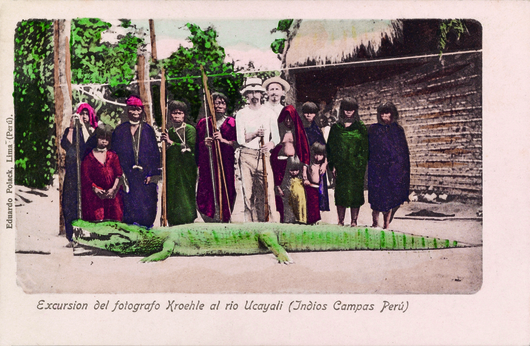 ** Arguine Escandon (Espagne/°1979) & Yann Gross (Suisse/°1981) : "Aya" ("Fantôme", "Âme", en quichua/ 2016-2019), un projet "pour se débarasser des images d'eldorado, de conquistadors, de 'sauvages' ", réalisé à partir d'une ancienne carte postale, montrant, au Pérou, le photographe-explorateur allemand Charles Kroehle (1876-1902), posant fièrement à l'arrière d'un crocodile mort, entouré d'indigènes amazoniens ... Un choc des représentations de l'Amazonie à un siècle d'écart. "Tandis que sur la carte postale, les sujets posaient sans arrière-pensée devant la dépuoille d'un crocodile, aujourd'hui, même les images les plus anodines (de l'Amazonie/ ndlr) sont travaillées par le se sentiment de la perte annoncée. L'Amazonie disparaît. Et 'Aya' anticipe déjà sa survie par l'esprit", écrit le duo de photographes.