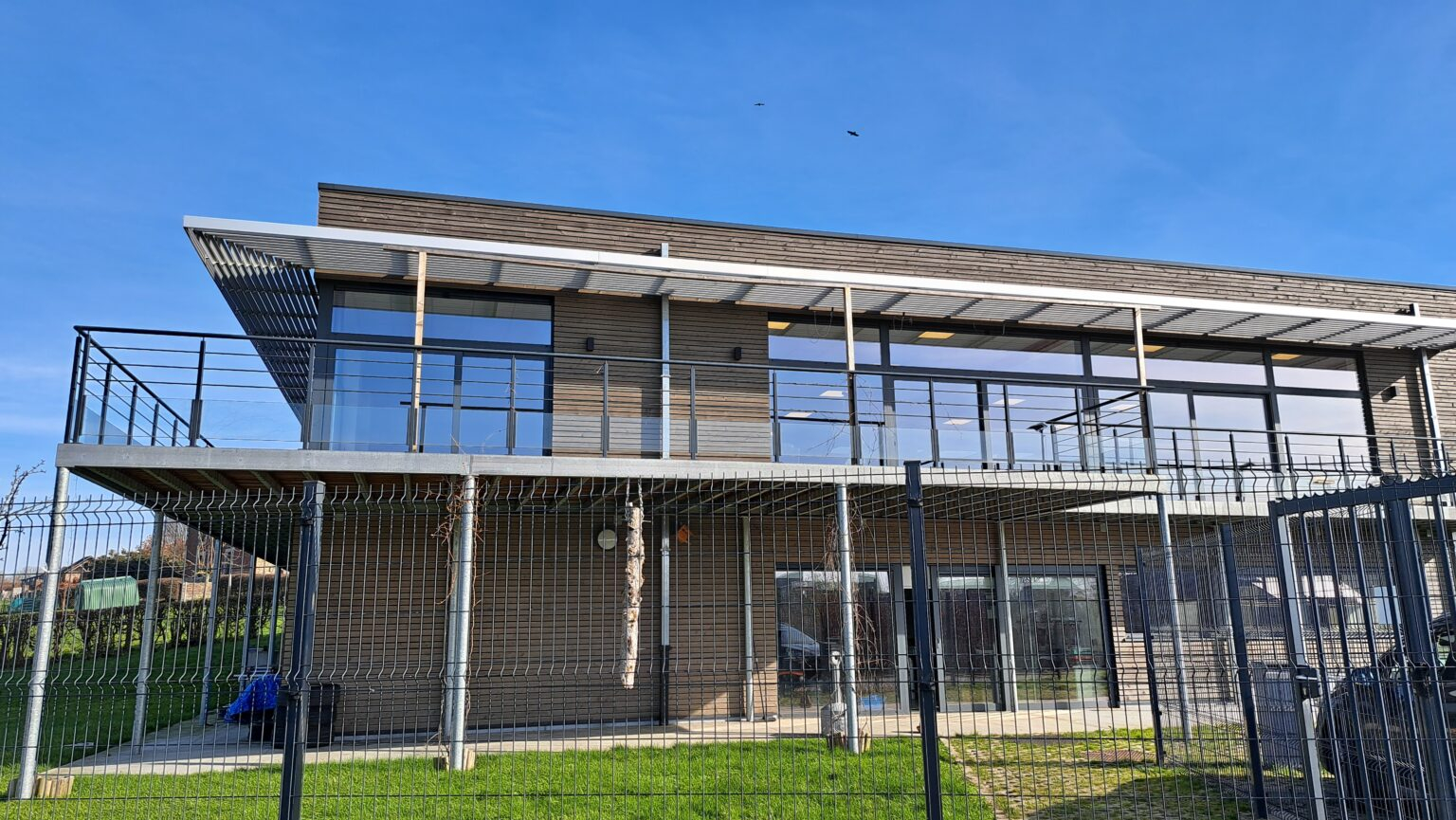Le bardage bois et la toiture verte lui permettent de s’intégrer harmonieusement au paysage.
