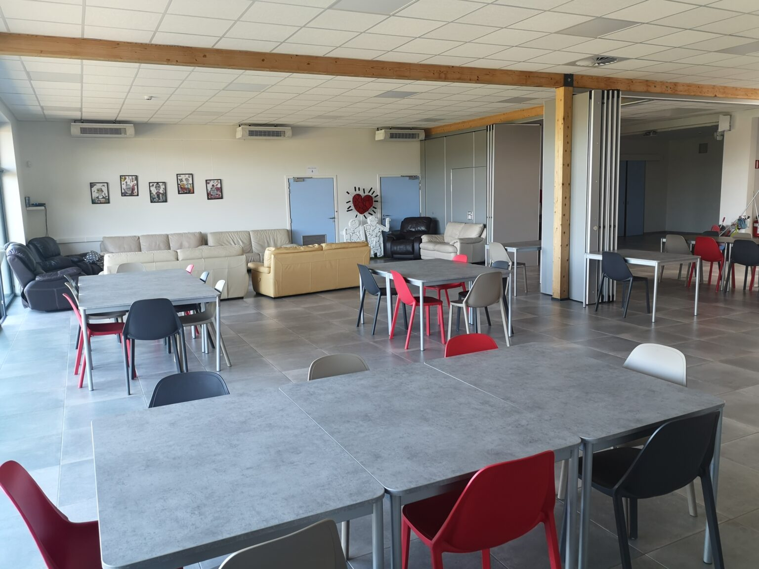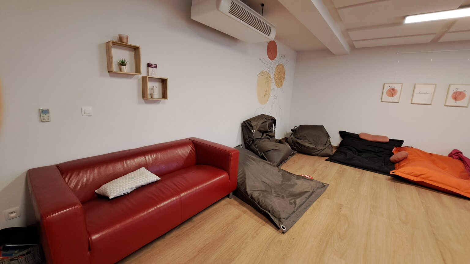 Au rez-de-chaussée, on trouve le grand espace de vie : lieu d’accueil, réfectoire, salon de détente,