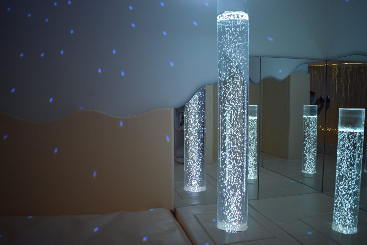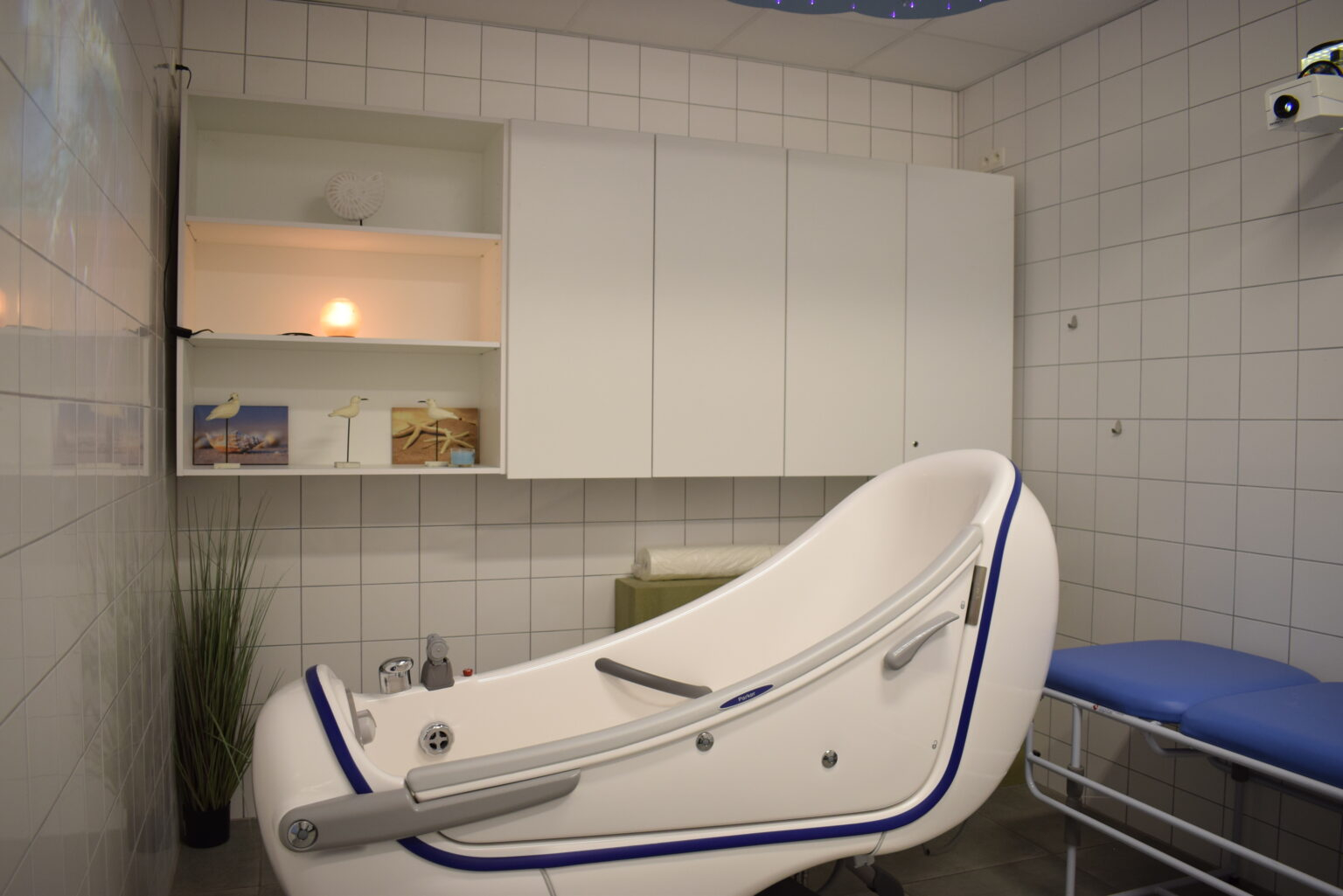 Le snoezelen se prolonge par une salle de bain totalement adaptée, équipée d’un système de projection et d’une sono et d’un espace de soin massage/pédicure.