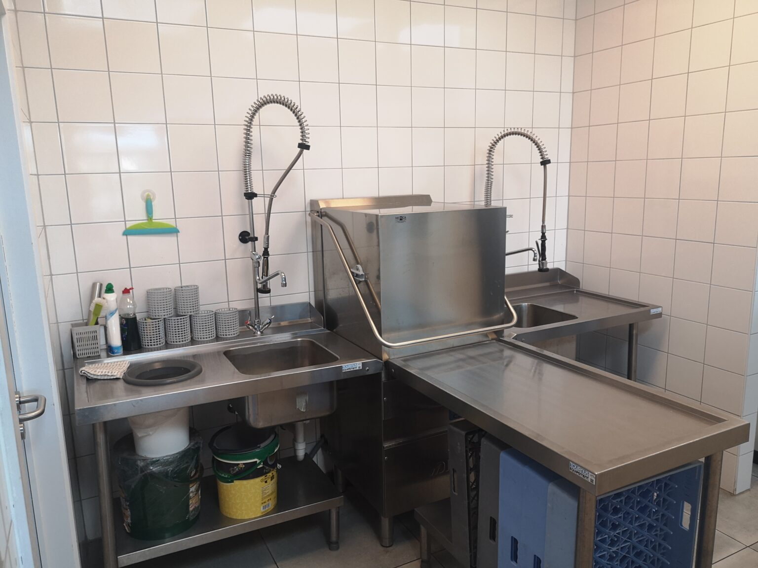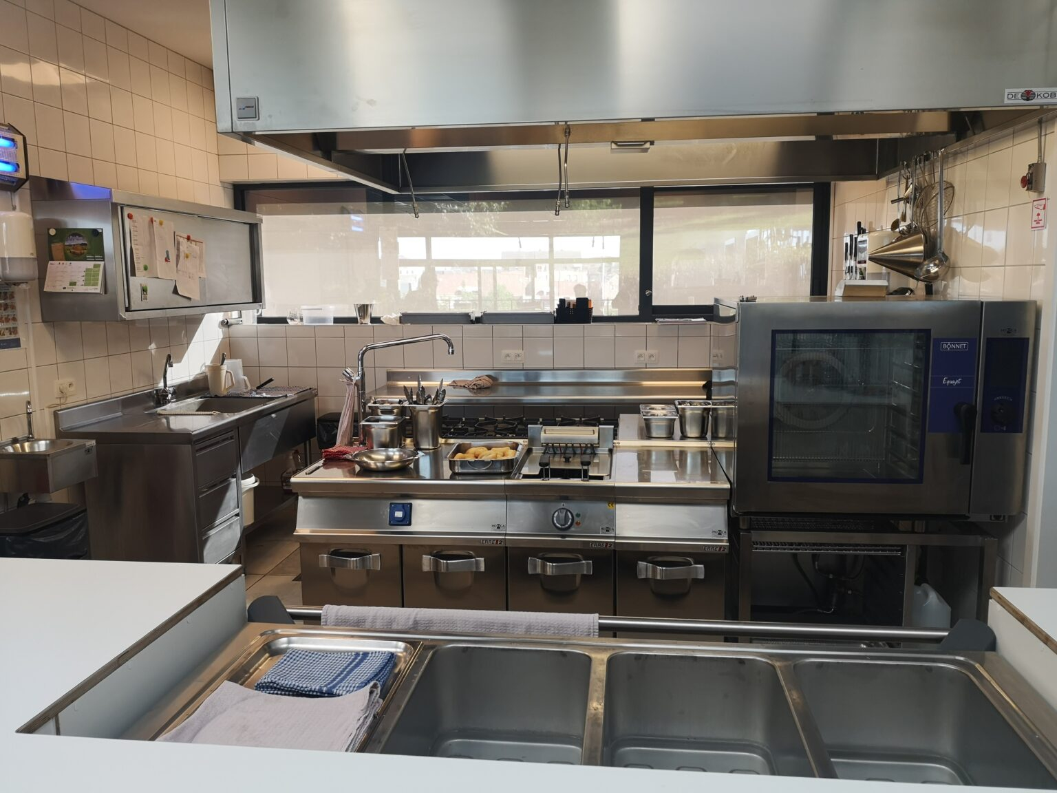 grande cuisine ouverte (agrée par l’AFSCA) et réfectoire et permet de faciliter le service pour le repas de midi. On y organise l’atelier cuisine et les bénéficiaires gèrent les vaisselles.