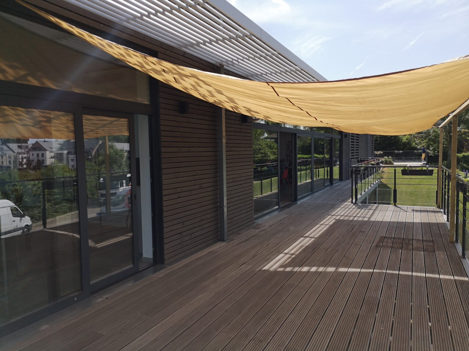 Une grande terrasse entoure ces espaces. Elle nous permet de profiter de la vue et est décorée chaque année par les plantations de fleurs réalisées par les bénéficiaires.