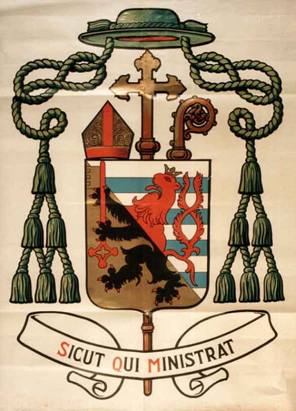 • Les armoiries de Mgr Cawet (Lion, noir: province de Namur; lion, rouge: province de Luxembourg)