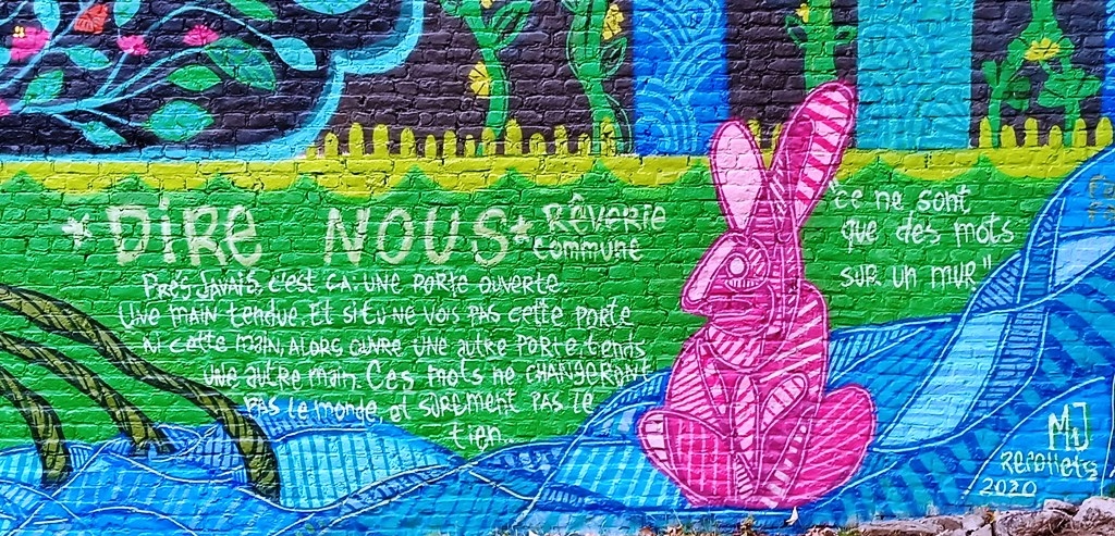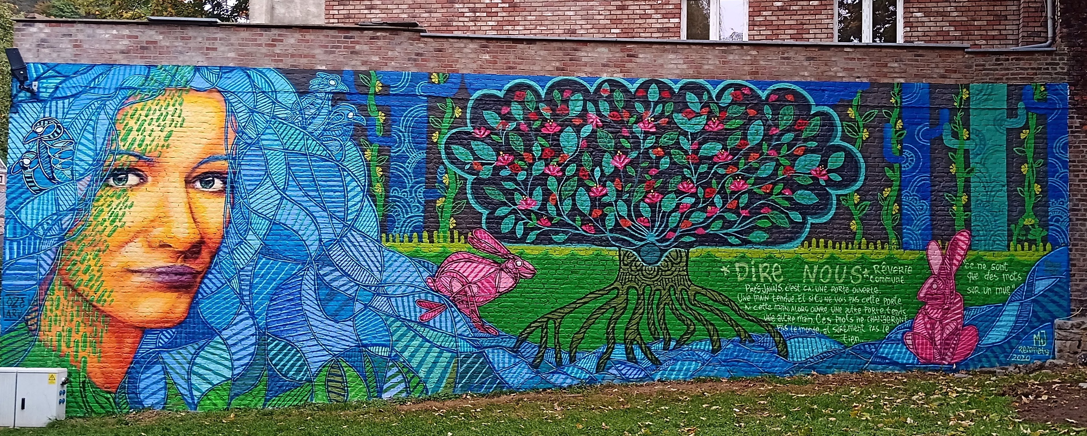 S’en sont suivies les realisations de l’ Enclos des Récollets, du quartier de l’Abattoir, de la rue Spintay, du terrain d’aventures de Hodimont et …ce samedi 17 octobre, une nouvelle fresque « Dire nous » a été inaugurée dans la plaine Lentz en Prés-Javais.