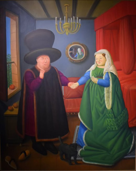 Un magnifique tableau nous est présenté au « BAM » : « Les Epoux Arnolfini », considéré comme l’un des plus grands chefs-d’oeuvre de l’Art flamand, réalisé en 1434, par Jan Van Eyck (vers 1390-1441). Ce tableau n’a jamais cessé d’intriguer et d’alimenter les théories des historiens. Son réalisme, son iconographie complexe, sa perspective orthogonale et son miroir étirant l’espace ne pouvait qu’attirer Fernando Botero.