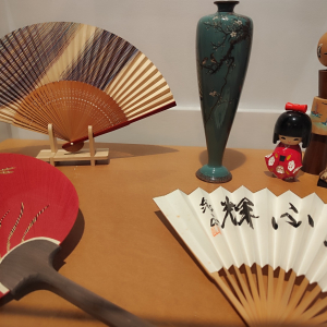 Des « machins japonais » (sic) sont, par ailleurs, exposés, d’une assiette, en faïence fine, du « Service Rousseau » – illustrée, en 1867, par deux artistes parisiens, le graveur & peintre Félix Braquemond (1833-1914) & François Eugène Rousseau, qui introduit le ‘japonisme’ dans la verrerie française – à un shamisen, en passant par des productions de la « culture pop », des vases & éventails.