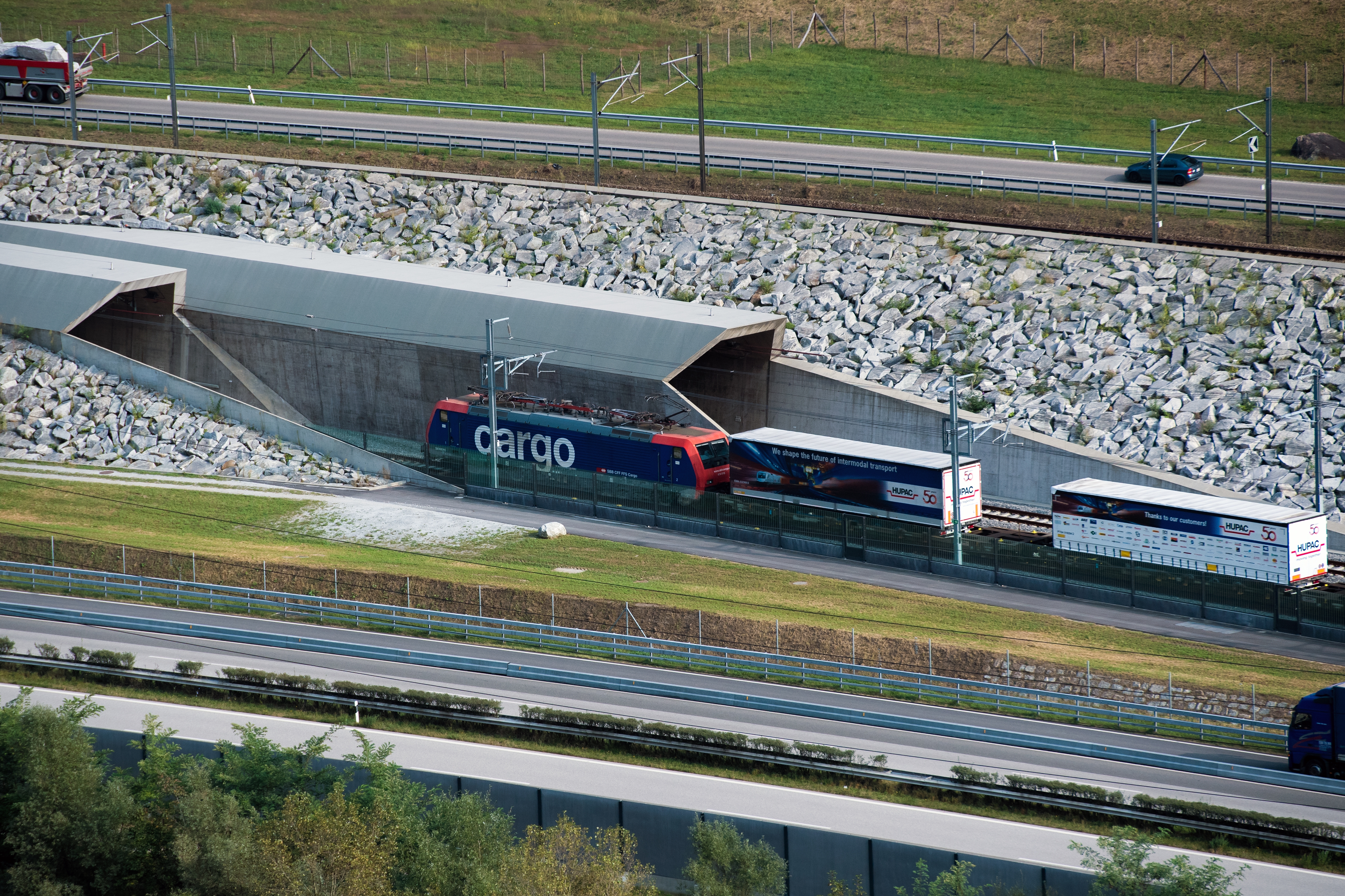 En offrant une alternative efficace à la route pour le trafic de marchandises et le transport de voyageurs à travers les Alpes, la NLFA donne un nouvel élan à la politique suisse de transfert de la route au rail. Sans cette politique, qui a permis au rail d’accroître ses parts de marché et d’absorber plus de 70% du trafic transalpin de marchandises, environ 800’000 camions de plus sillonneraient les Alpes chaque année. Malgré l’augmentation générale du trafic, le nombre de courses de camions à travers les Alpes a diminué, passant de 1,4 million en 2001 à environ 900’000 en 2019. L’objectif initial ne sera toutefois atteint que lorsque ce chiffre ne dépassera pas la limite de 650 000.