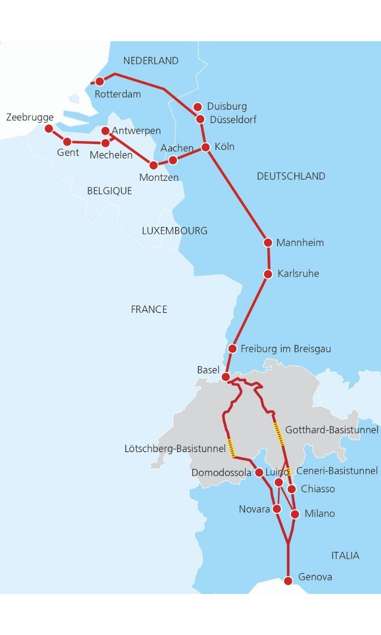 En construisant ces deux axes, celui du Lötschberg et celui du Gothard, la Suisse apporte une contribution substantielle à la politique européenne des transports. La ligne ferroviaire entre Rotterdam/Zeebruges et Gênes est la ligne la plus utilisée pour le transport de marchandises en Europe et selon les prévisions, le volume de fret devrait encore augmenter sensiblement. Cette ligne traverse le cœur industriel de l’Europe et permet de relier des régions économiques dynamiques aux villes de Rotterdam, Amsterdam, Anvers, Duisbourg, Cologne, Francfort, Mannheim, Bâle, Zurich, Milan et Gênes. Grâce aux nouveaux tunnels de la NLFA, qui traversent les Alpes à l’altitude du Plateau suisse et prennent le relais des lignes de faîte existantes, la capacité du réseau pour le trafic de marchandises va considérablement augmenter. En raison du faible dénivelé de la ligne, les trains circulant sur l’axe du Gothard n’auront plus besoin à l’avenir de locomotive de pousse supplémentaire, ce qui représente un gain en termes de temps et d’argent. La NLFA permet en outre la circulation de trains plus longs et plus lourds.