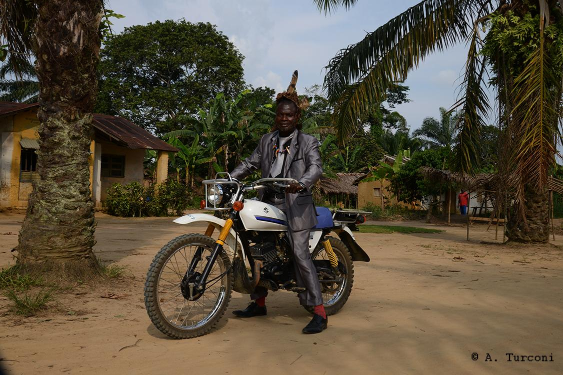 Parmi ses clichés, notons ce chef d'un village Pende, photographié chez lui, en 2017, dans une mise-en-scène conçue par lui, avec ses attributs traditionnels, mais aussi des références plus modernes. Autre chef, Mongo, quant à lui, se voulant moderne, il est photographié, en 2017, dans son Village de Monkoto, en costume occidental, trônant sur une moto, avec, en contraste, ses attributs coutumiers. Portrait plus simple, cette gardienne d'un Parc national prenant le temps de se maquiller pendant son service.