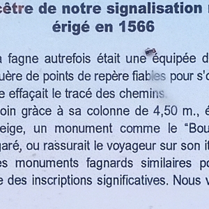 Boultè, bourtè, boultay, Perron des Fagnes ou encore Ronde Pierre, sont les dénominations les plus usuelles pour désigner la colonne que l’on découvre en bordure de route, à 200 mètres au sud-est de la Baraque Michel. Haute d’environ 4,5 m, elle a été érigée en 1566 à l’initiative des familles Hauptmann et Panhaus. On croit savoir qu’elle aurait servi de borne - repère sur le vieux chemin de Limbourg conduisant à Sourbrodt. Le pied et les deux fûts centraux de ce monument sont en arkose de Waimes provenant de la carrière de Hotleux. Le Boultè fut complètement renversé en 1878 avant d’être redressé en 1905. La même année, la partie supérieure du fût faillit être réduite en menus morceaux par les services de l’administration prussienne des Ponts et Chaussées pour l’utiliser à l’empierrement de la route Eupen - Sourbrodt. Mais de vaillants fagnards élevèrent d’énergiques protestations et triomphèrent dans leurs justes revendications. L’année suivante, une pomme de pin ( pigne ) qui surmontait le Perron de Malmedy ( érigé sur la place du Marché, l’actuelle place Albert 1er et détruit le 12 février 1798 ), fut retrouvée dans un jardin de Malmedy avec d’autres vestiges de monuments brisés. Il est très vraisemblable que ce soit cette pigne qui couronne encore aujourd’hui, la colonne fagnarde. En décembre 1944, lors de l’offensive des Ardennes, le Boultè fut renversé par une niveleuse des troupes américaines. Elle fut redressée le 5 juin 1947 par « Les Amis de la Fagne ». La pigne fut alors surmontée d’une croix latine en bronze. En 1958, suite à l’élargissement de la route, elle fut déplacée de deux mètres par cette même association pour se retrouver à l’endroit actuel. ( Le Vlan / J.F. )