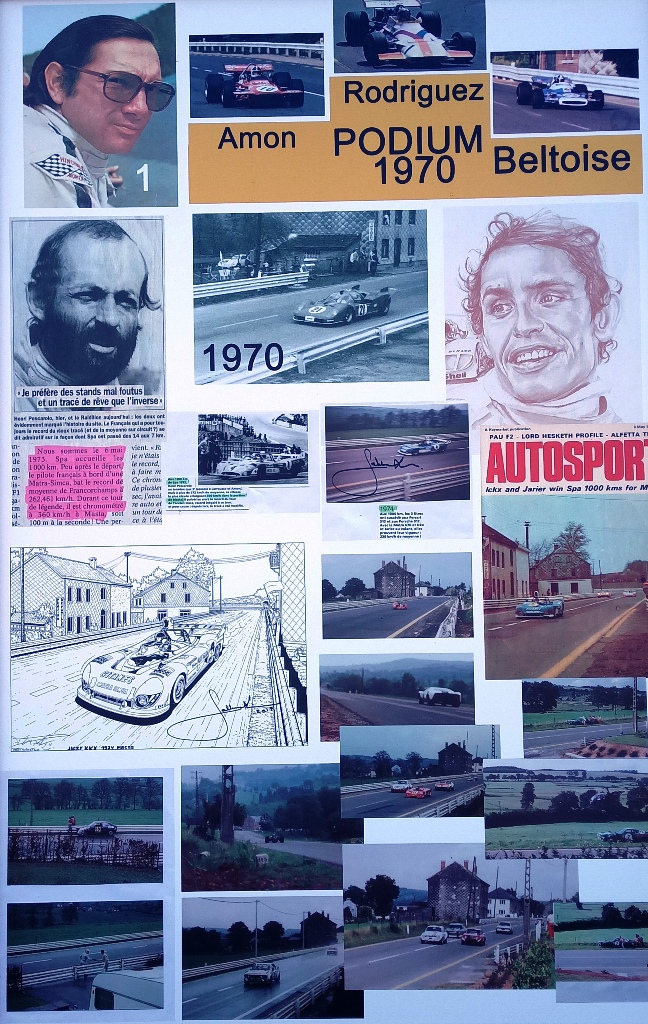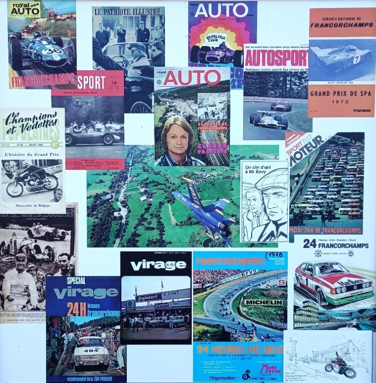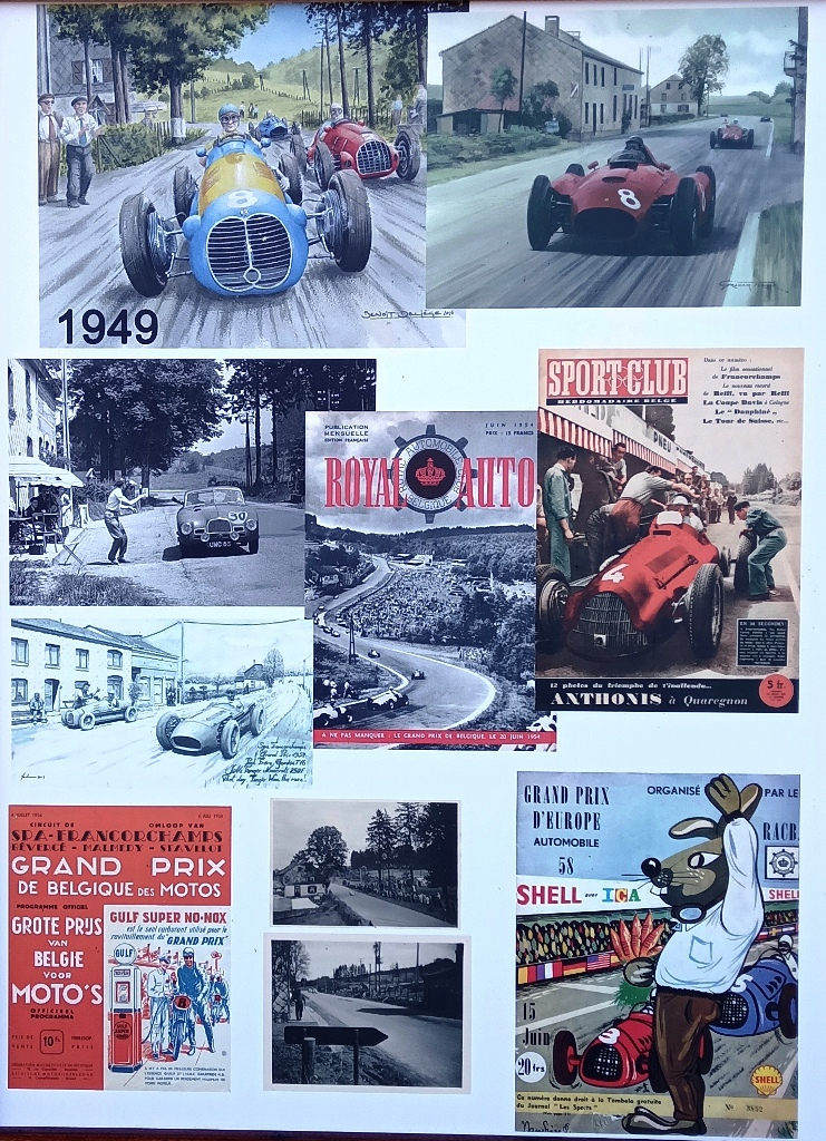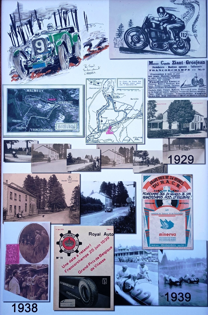 Sur plusieurs mètres de panneaux, il a rassemblé ses documents, avec en fil conducteur, la maison familiale. "La première photo montre la maison alors qu’il n’y avait pas encore le circuit, dans les années 1900. Après on voit l’évolution du lieu, l’évolution du circuit, les premières courses, avec les motos d’abord. Il y a une photo de 1929, une de 1932 et on avance comme ça progressivement, jusqu’en 78." Lorsqu’il imagine l’exposition, Vincent Gaspar se rend compte que toutes les époques ne sont pas représentées sur les panneaux. Il décide alors de faire faire quelques illustrations par des dessinateurs professionnels, par Benoit Deliège et Christian Papazoglakis par exemple.