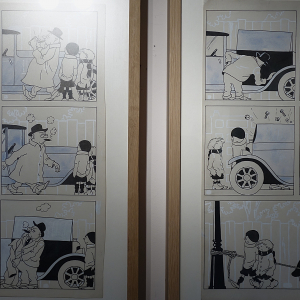 Alors que dans le première salle, nous trouvons différentes couvertures, avec des illustrations en format carré, du « Petit Vingtième » (1928-1940), avec la présence de « Quick et Flupke », dans la seconde salle, nous découvrons les planches originales de quelques gags, parfois surprenants, voire à la limite de l’absurde, comme celui où l’on voit un automobiliste ne parvenant pas à faire démarrer son véhicule. Ayant tombé la veste, sa chemise portant des traces de cambouis, pour vérifier l’état du moteur, il est désespéré, … alors que, tout simplement, le pare-choc arrière de sa voiture avait été attaché à un réverbère, par les deux « Gamins de Bruxelles » …