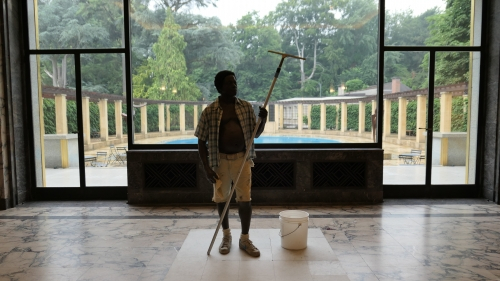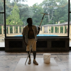 Entre ces deux salons, devant les vitres offrant une vue sur la piscine de la « Villa Empain », nous trouvons, bien éloigné d’un Saint ou d’un président, … un « Window Washer » (« Laveur de Vitre »/1984), prêté par la « Gagosian Gallery », de New York, une création, en bronze polychromé et en matériaux mixtes, du sculpteur hyperréaliste américain Duane Hanson (1925-1996), qui écrivit : « Mon travail traite de gens qui vivent dans un désespoir silencieux », … de là à en faire une icône, à chacun son jugement !