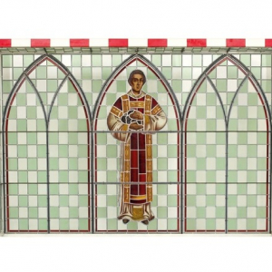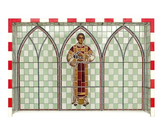Dans la seconde salle, Wim Delvoye (°Wervicq/1965) présente plusieurs oeuvres, dont son étonant « Saint-Stephanus » (1990), devenu, en soutane, un gardien de but, tenant dans ses mains un ballon de handball, le sport et la religion semblant, ainsi, se confondre, une création en verre coloré, métal et peinture émaillée sur acier (200 x 300 x 100 cm).