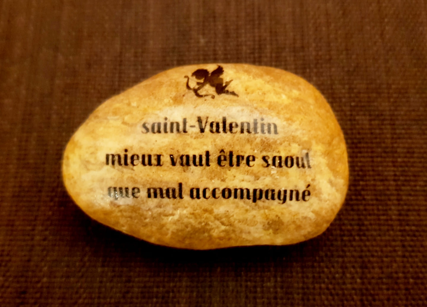 saint-Valentin sur du pavé à lettres à l'enseigne d'un dieu païen de l'amour bête noire de l'apôtre Paul et combien davantage de l'évêque d'Ypres fondateur du Jansénisme interpelle. D'autant que son "s" initial de la phrase est minuscule.