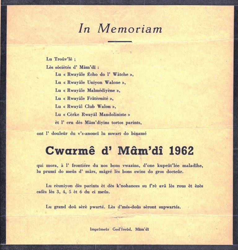 Si la fête n’a pas l’ampleur à laquelle on devait s’attendre, fête il y a. On voit déambuler de petits groupes de costumés le dimanche 4 mars dans les rues de Malmedy, plus pour célébrer la disparition du carnaval que la fin de l’hiver. Les quelques résistants font montre de la satirique souvent rencontrée durant cette période : un pseudo avis mortuaire au Cwarmê d’Mam’dî, des personnes déguisées en médecins vaccinant les passants, des malades du virus et surtout la pose d’une haguète terrassée avec à ses pieds une couronne de fleurs et un drapeau français brodé « Beaune » en berne1. Ici, comme à Eupen et La Calamine, c’est surtout dans les bars que les gens s’attroupent pour les réjouissances sans craindre une sanction.