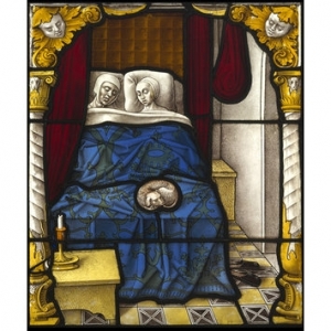 Propos de Tim Walker : « J’éprouve une réponse émotionnelle concernant la couleur transparente. C’est spécial pour moi. Ce vitrail est une représentation touchante dégageant une atmosphère de confort et de convivialité. Le chien, le couple au lit, les pantoufles, cela me fait me sentir en paix. Le rouge vif des rideaux rappelle mon enfance alors que ma mère fabriquait des abat-jours en soie rouge, qui illuminaient la maison familiale, une lueur accueillante pour rentrer chez soi. »