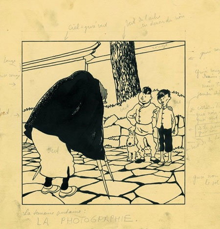 En page 71, nous trouvons la reproduction d’un dessin original, en noir et blanc, annoté de multiples précisions sur le choix des couleurs et des grisés, destinées à l »imprimeur, pour la couverture du « Petit Vingtième », du 27 juin 1935.