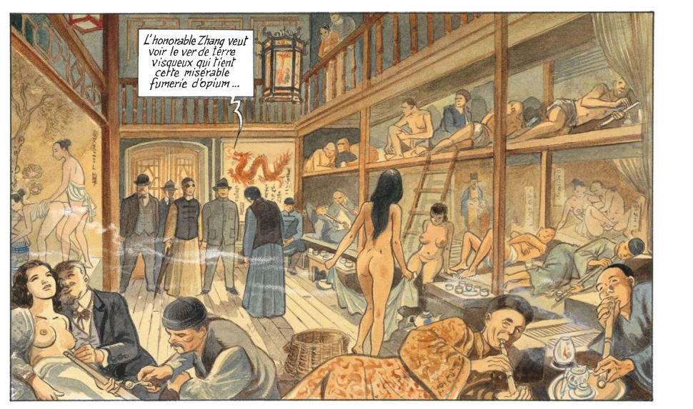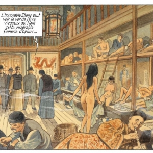 Ci-dessous, une case d’une fumerie d’opium, fantasmée par Jean-Francois Charles, non reprise dans le présent magazine, mais qui illustre le propos de son épouse, Maryse Charles, le temps ayant fait son oeuvre et la bande dessinée ayant fort évolué depuis l’époque du « Lotus bleu », édité en noir et blanc par « Casterman », il y a 65 ans.