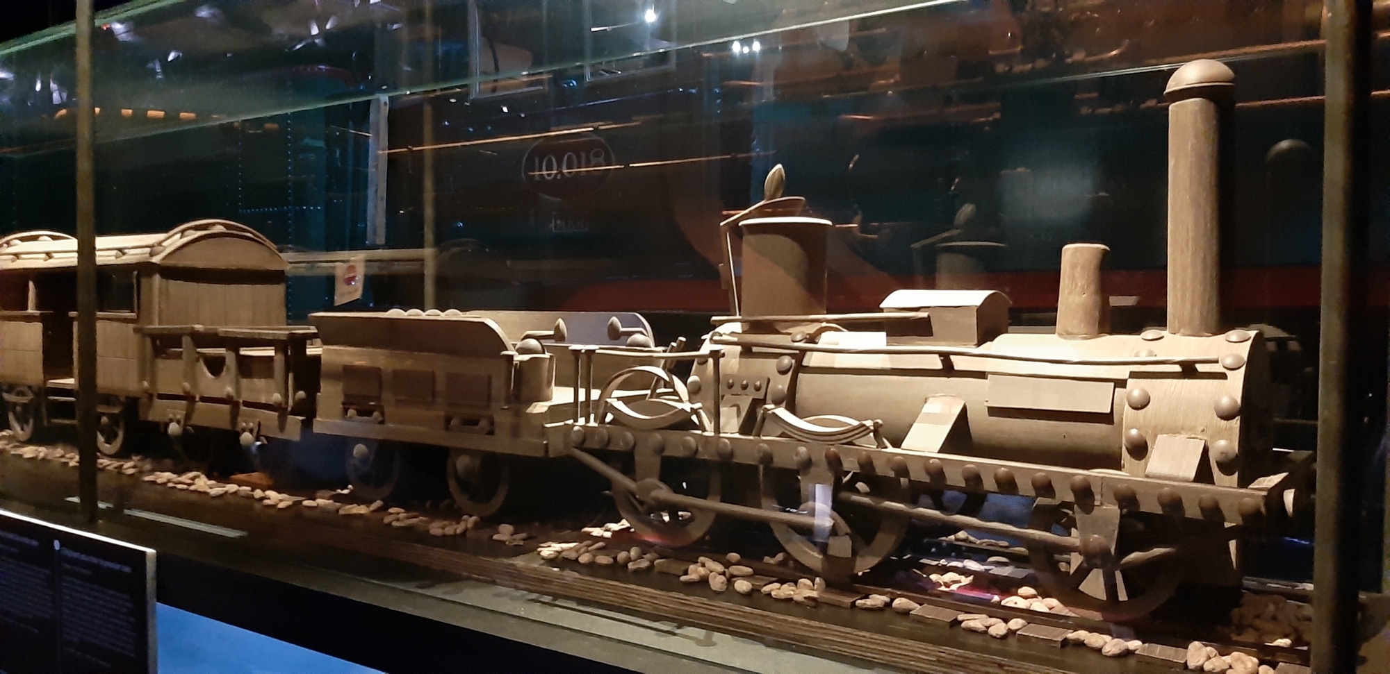 Pour le « plat de résistance »,… en chocolat, prenons l’air extérieur et pénétrons dans le batiment moderne, inauguré, en 2015, par le Roi Philippe, et découvrons, dès notre entrée, différentes locomotives historiques et leurs répliques en chocolat.