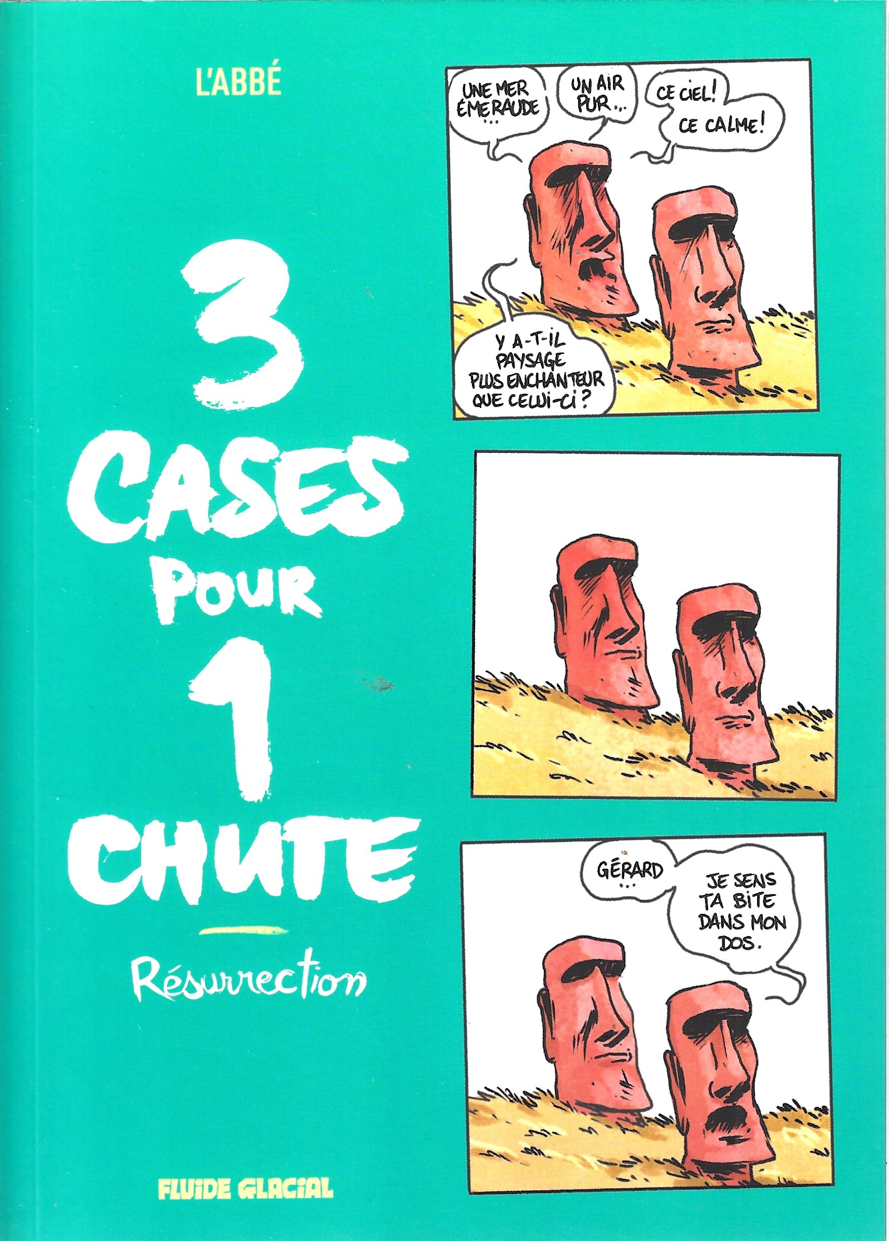 3 cases pour une chute, c’est le concept originel, la contrainte que s’impose L’Abbé pour réussir en un minimum de temps à vous faire rire au maximum. Et c’est d’une efficacité redoutable. Sur le ton de l’humour absurde et trash, L’Abbé déploie devant vos yeux ébahis son art et sa maîtrise du strip.