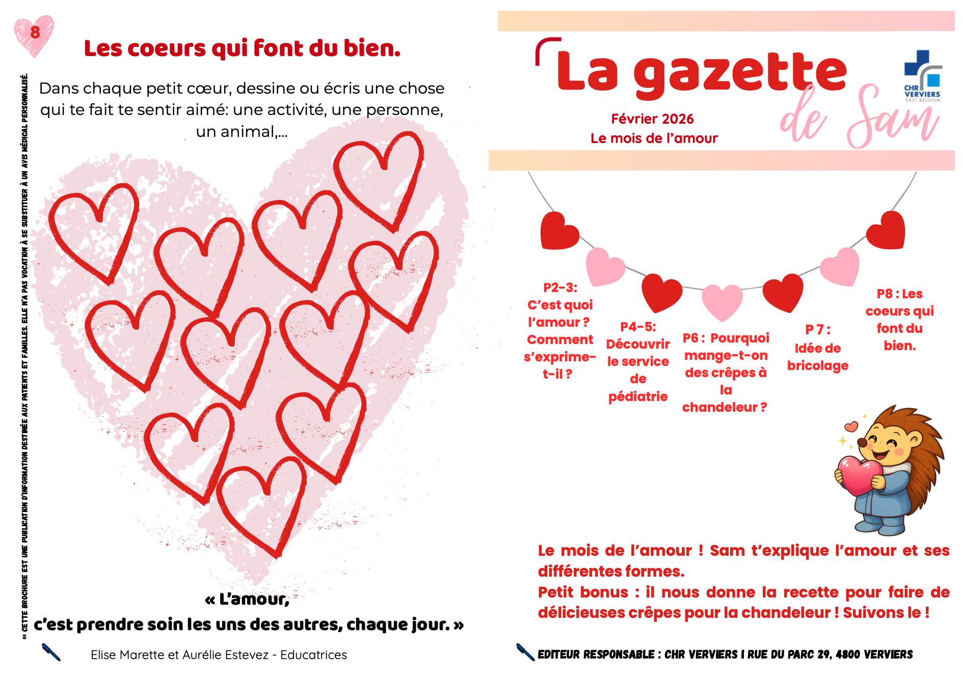 Depuis le mois de septembre 2025, le service de pédiatrie du Centre Hospitalier Régional de Verviers donne vie à un nouveau personnage destiné à accompagner ses petits patients : Sam, un petit hérisson curieux et bienveillant, pensé pour les aider à mieux comprendre leur quotidien à l’hôpital.
