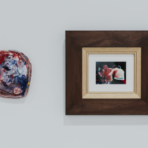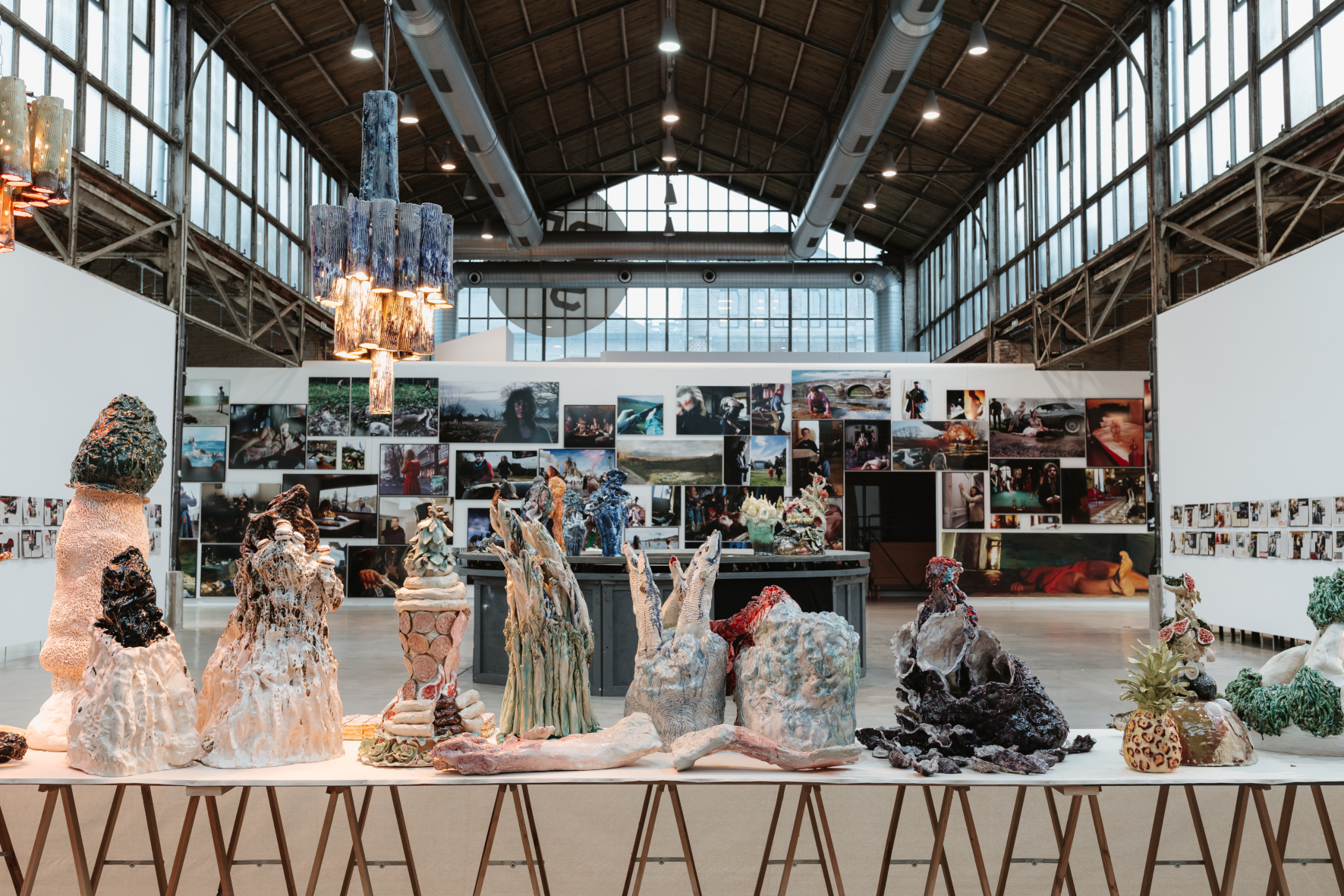 complexe. Face à cette mise en scène mêlant mythes fondateurs et renaissance, le banquet de céramiques se présente comme l’incarnation tangible de cette transformation. Chaque pièce, chairs d’émail et formes grotesques, devient symbole d’une incarnation désordonnée, presque baroque, de la pulsion créatrice. Par contraste, le mur de tableaux-photographiques archive des fragments du réel - les faits divers - comme autant de micro-mythologies populaires figées dans le temps.
