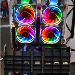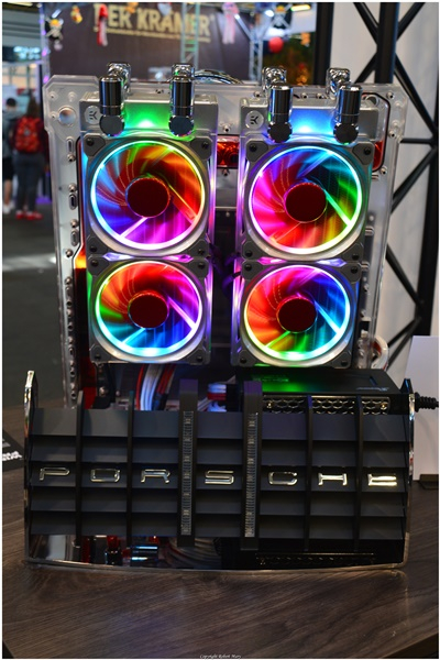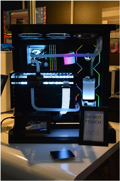 La grande nouveauté cette année fut la présentation de modèles de PC gaming haut de gamme par refroidissement à eau (société AIOS de Eke et firme FENN à Lievegem). Le design est effectivement original (Darth Vader, Gulf Porsche, ...) mais tout à un prix (on arrive vite à 3.500 € l'unité...). Les PC de FENN étaient testables sur grands écrans courbes.
