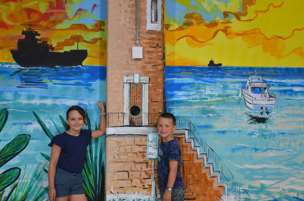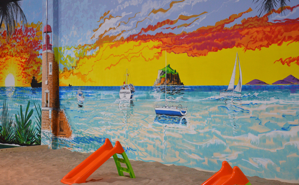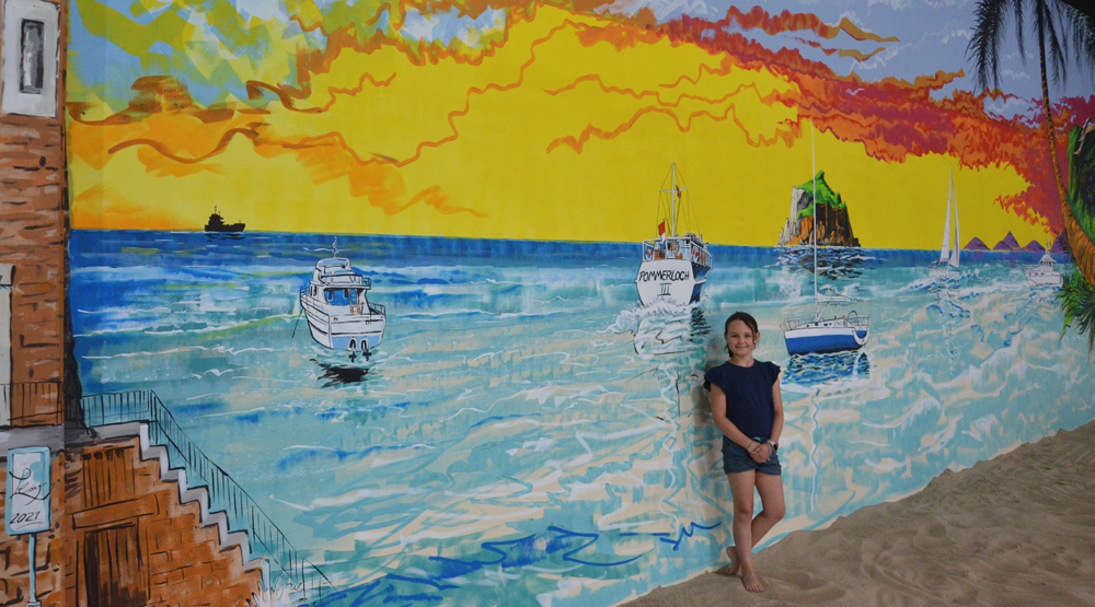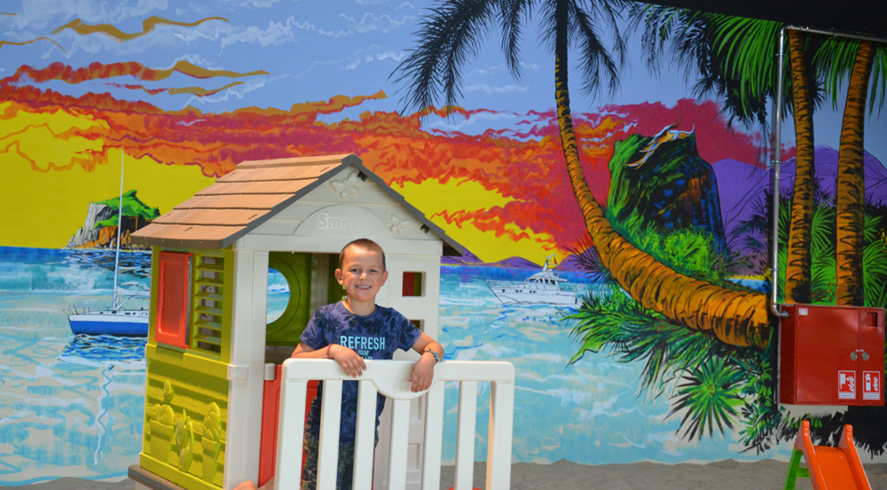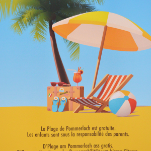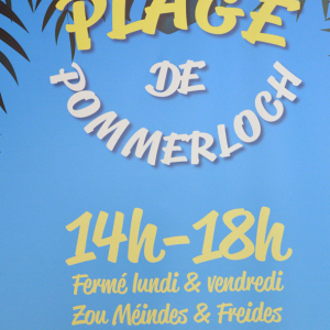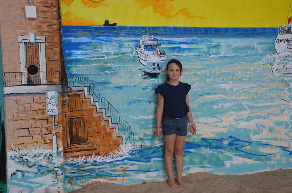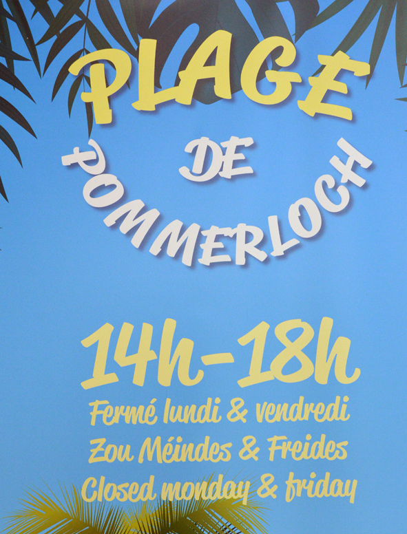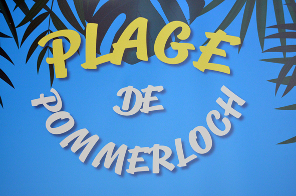 Sous la surveillance des parents visitant le centre commercial, les enfants jouent sur la plage de Pommerloch au Luxembourg devant une fresque monumentale réalisée par Jean-Marie Lesage. L'entrée est gratuite.