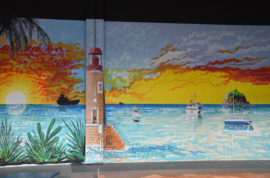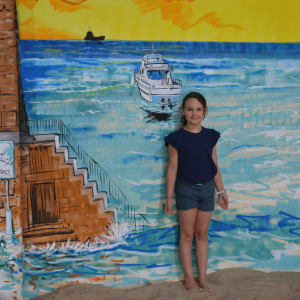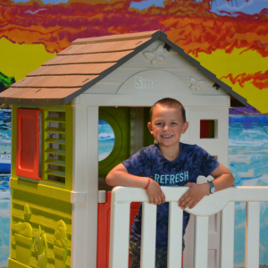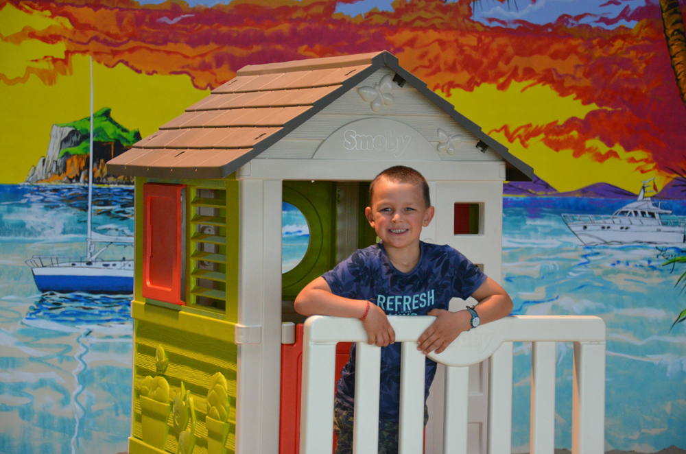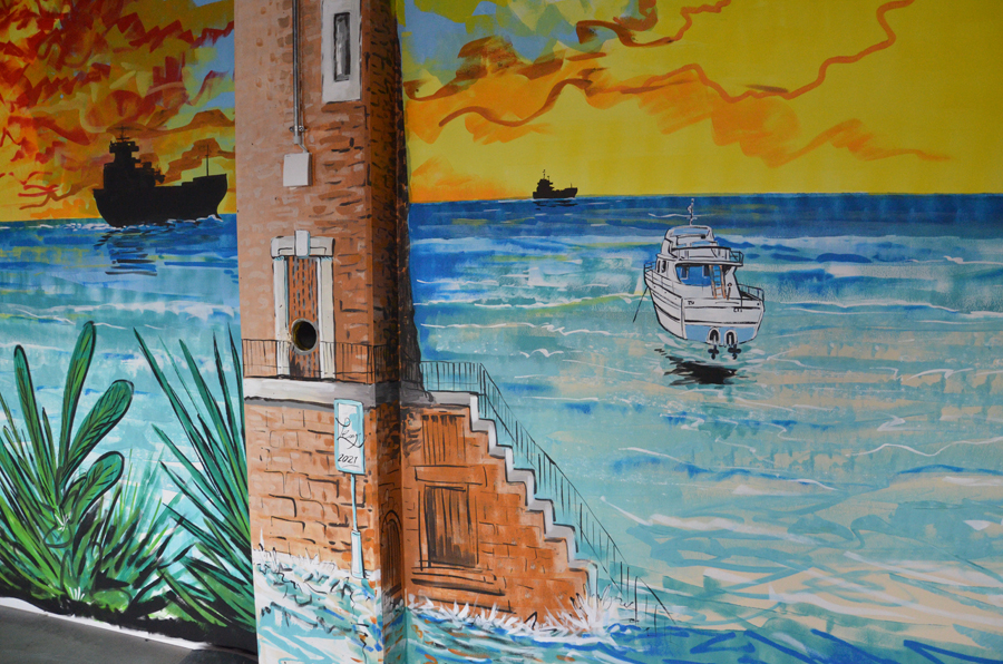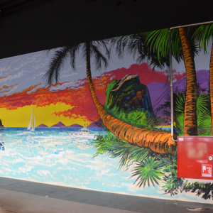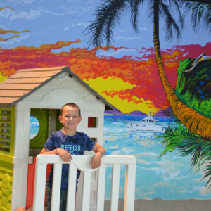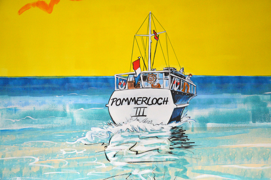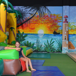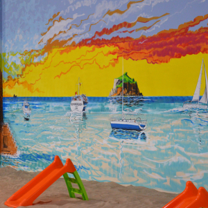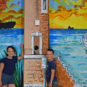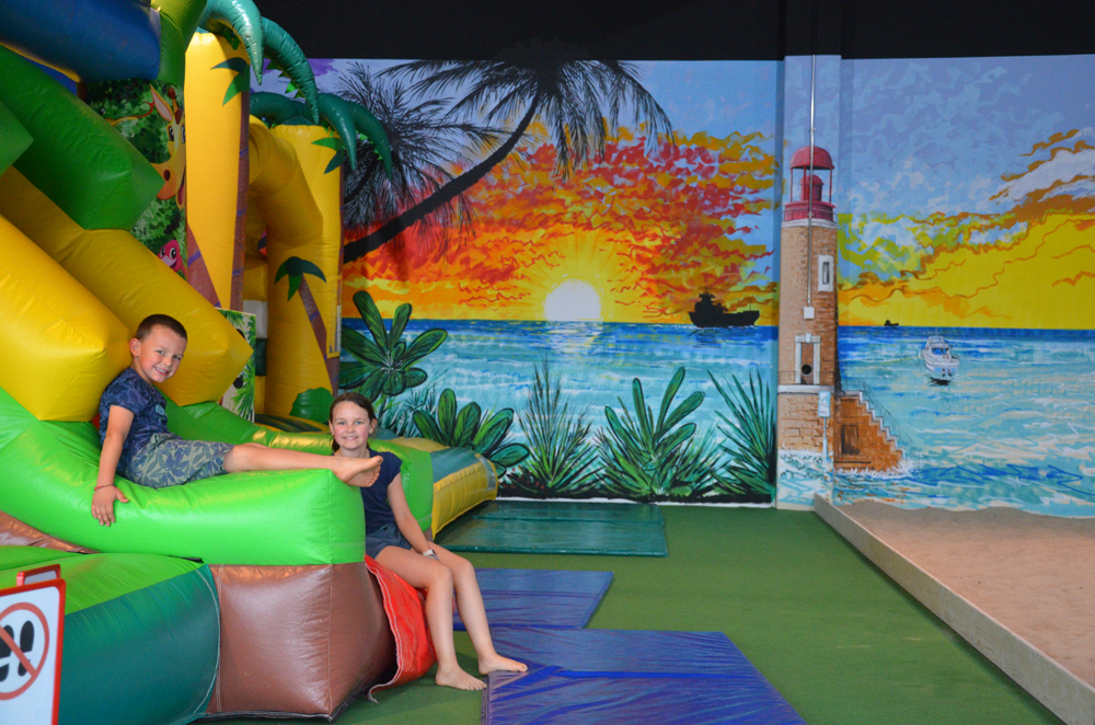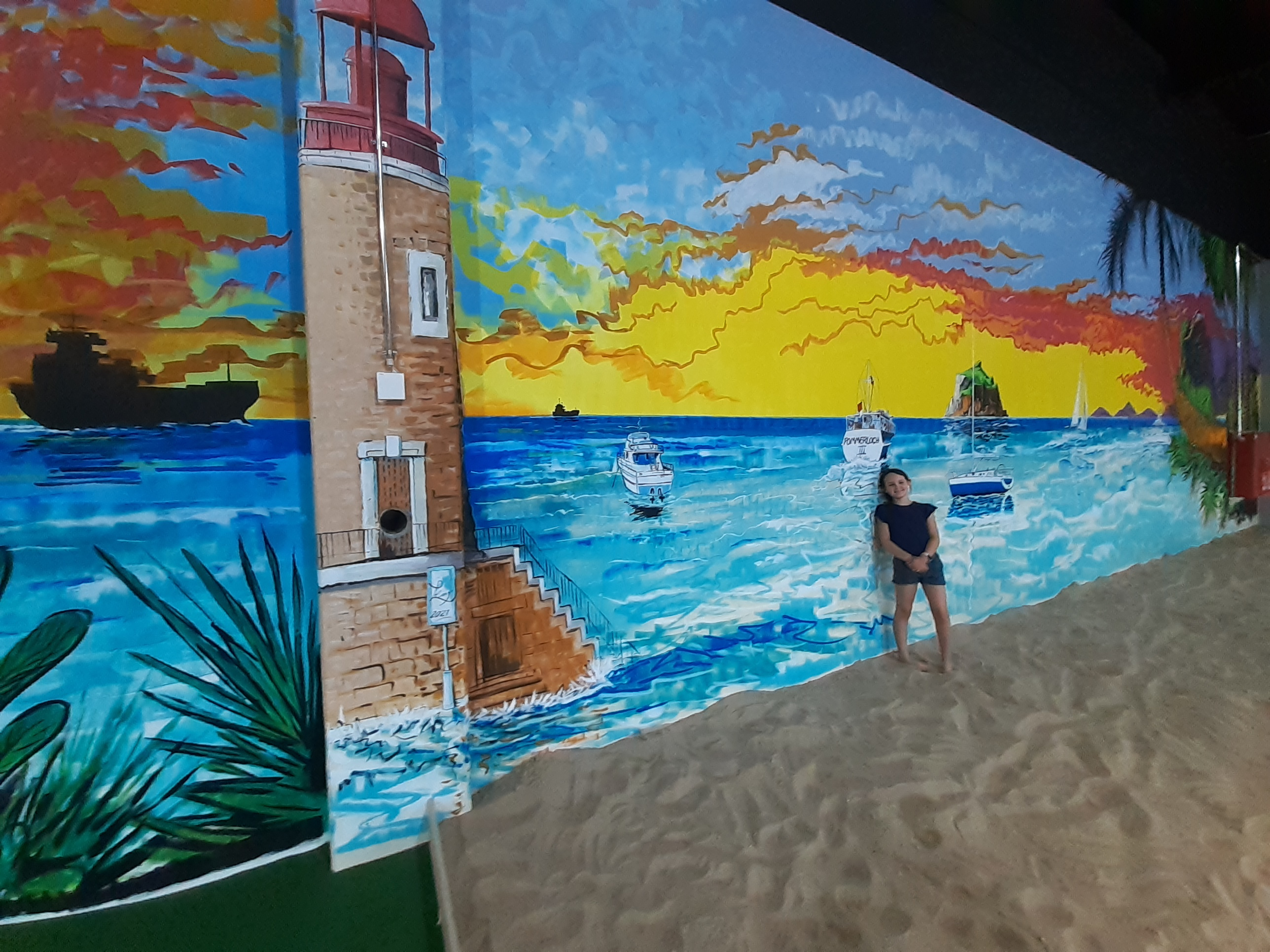 Sous la surveillance des parents visitant le centre commercial, les enfants jouent sur la plage de Pommerloch au Luxembourg devant une fresque monumentale réalisée par Jean-Marie Lesage. L'entrée est gratuite.