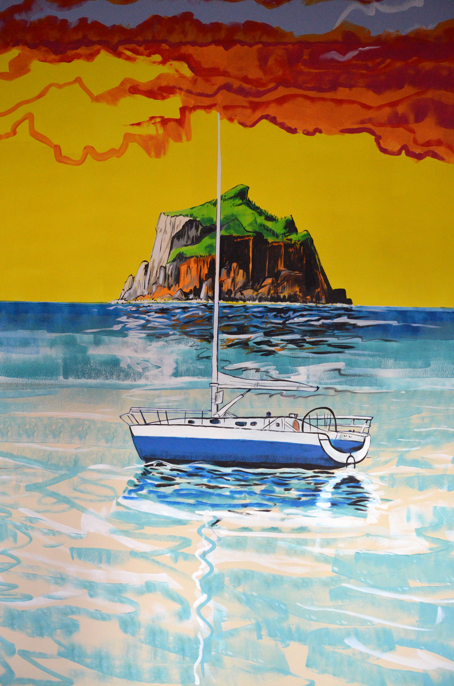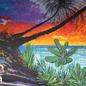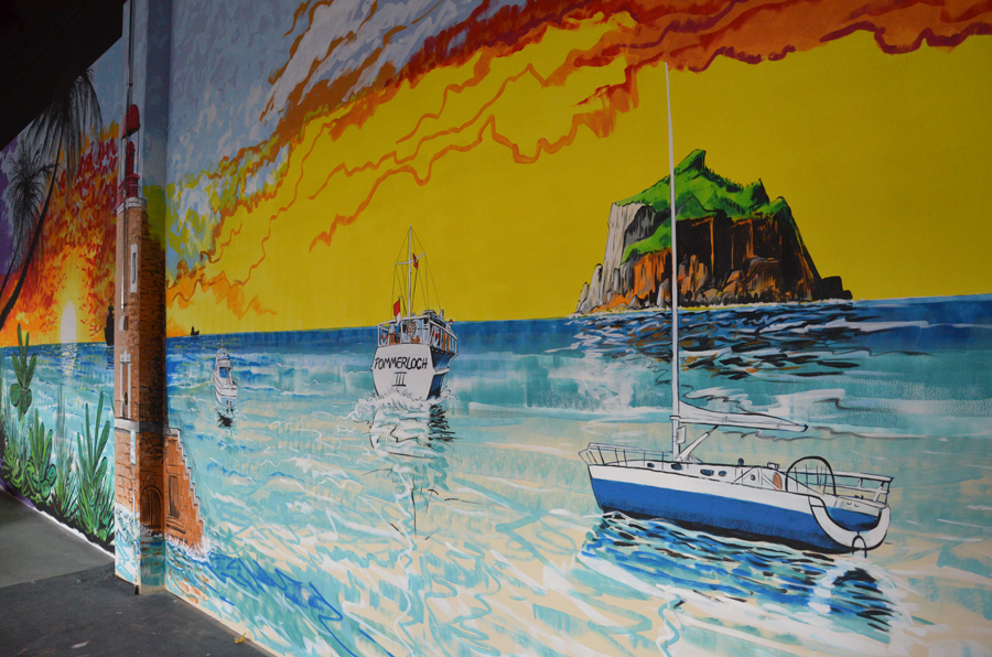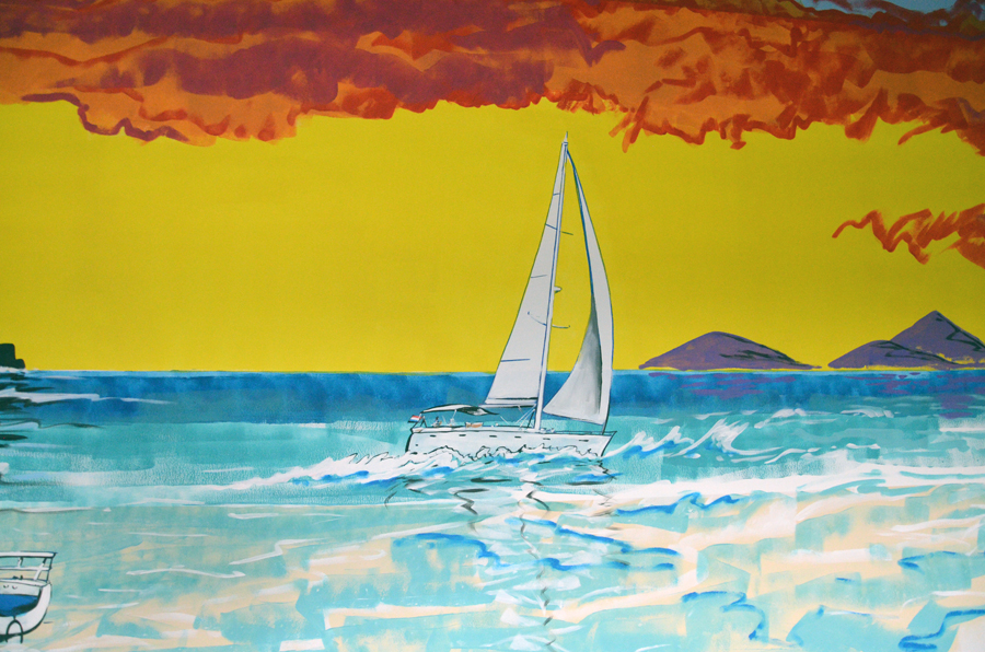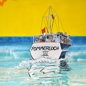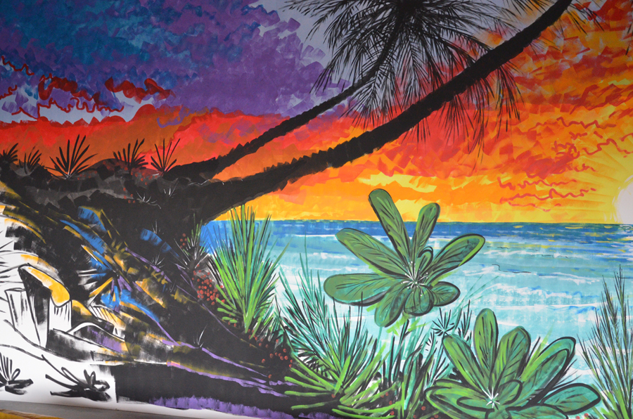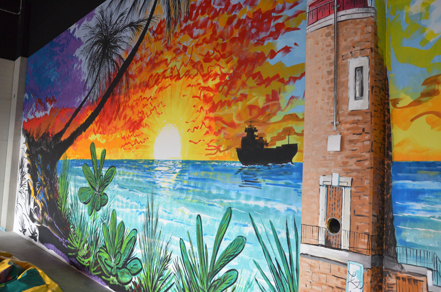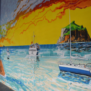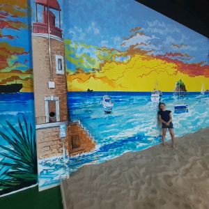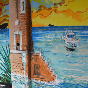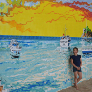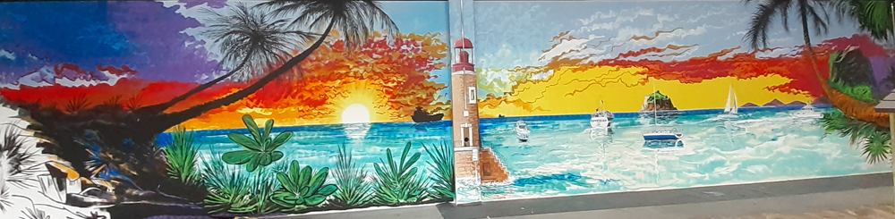 Sous la surveillance des parents visitant le centre commercial, les enfants jouent sur la plage de Pommerloch au Luxembourg devant une fresque monumentale réalisée par Jean-Marie Lesage. L'entrée est gratuite.